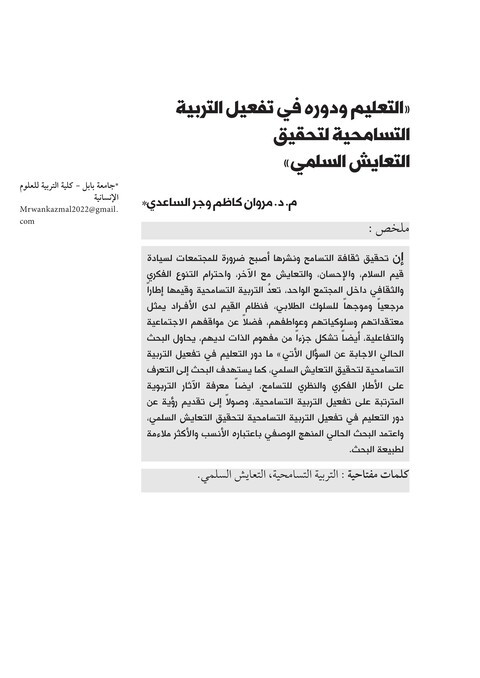 التعليم ودوره في تفعيل التربية التسامحية لتحقيق التعايش السلمي (مجلة حمورابي للدراسات; Vol. 1, No. 46) استكشف المواضيع الرئيسية