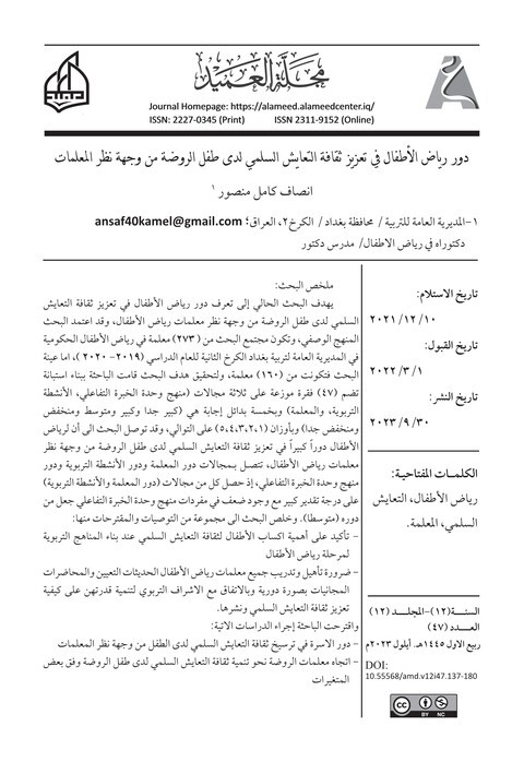 دور رياض الأطفال في تعزيز ثقافة التعايش السلمي لدى طفل الروضة من وجهة نظر المعلمات (مجلة العميد; Vol. 12, No. 47)
