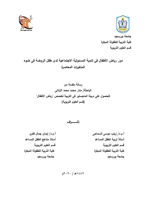دور رياض الأطفال في تنمية المسئولية الاجتماعية لدى طفل الروضة (المجلة العلمية لكلية رياض الأطفال ببورسعيد; Vol. 2020, Issue 16)
