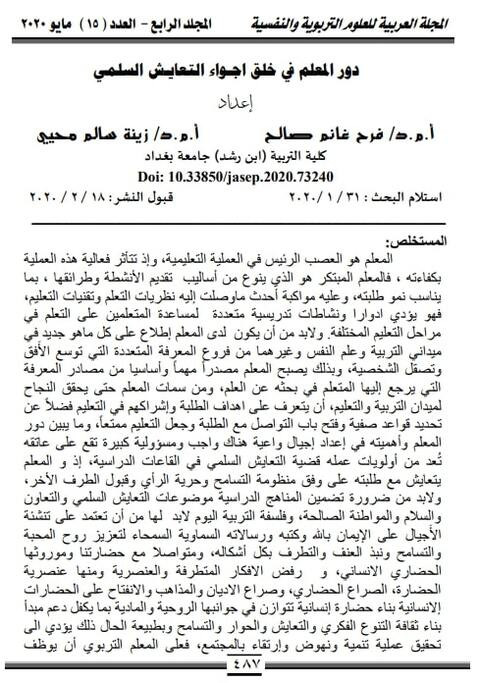 دور المعلم في خلق اجـواء التعايـش السلمي (المجلة العربية للعلوم التربوية والنفسية; Vol. 4, No. 15)