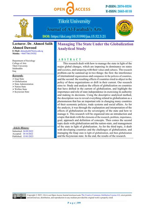 إدارة الدولة في ظل العولمة: دراسة تحليلية (مجلة آداب الفراهيدي؛ Vol.15, Issue.52-3)