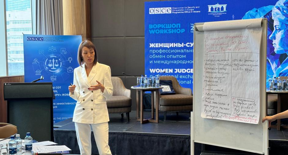Empowering Women Judges in Kazakhstan through International Exchange 2024-05-08 Judge Rsaldy Kakisheva presenting on advantages of creating a women judges association during the interactive session of the workshop for women judges, Astana, 14-15 March 2024 (OSCE) Photo details On 14-15 March 2024, women judges from Kazakhstan and around the world convened for a two-day hybrid workshop in Astana entitled “Women judges: professional exchange of experience and international co-operation” in Astana. Aligned with the International Day of Women Judges on 10 March, the event was dedicated to fostering collaboration and sharing expertise to promote gender equality within the judicial system and enhance the rule of law. The workshop, organized in co-operation with the Supreme Court, commenced with an official opening by Aslambek Mergaliyev, Chairperson of the Supreme Court of the Republic of Kazakhstan. Welcoming speeches were delivered by Dr. Volker Frobarth, Head of the OSCE Programme Office in Astana; Elvira Azimova, Chairperson of the Constitutional Court of Kazakhstan; and Yelena Maksyuta, judge of the Supreme Court of Kazakhstan. The first day of the workshop featured two engaging sessions, providing an opportunity for insightful discussions among esteemed women judges and legal experts. The first session centered on the importance of international collaboration among women judges and the establishment of their national associations. Robyn Tupman, Secretary/Treasury of the Australian Association of Women Judges, shared methods of international support for national associations, while Jacob Bonnevie, OSCE/ODIHR Rule of Law Adviser, offered insights on gender dynamics within the judiciary. Dr. Sabina Garahan, lecturer at Essex School of Law (UK), presented recommendations from a comparative study of women judges’ associations across the OSCE region, while Dr. Khalida Azhigulova, human rights defender and gender expert in the justice sector (Kazakhstan), emphasized the role of women's associations in the justice system. The subsequent session explored experiences in establishing and managing national associations of women judges. Chinara Aidarbekova, judge of the Constitutional Court of the Kyrgyz Republic, shared insights from the Kyrgyz Association of Women Judges, focusing on strategies for improving access to justice for vulnerable groups. Margaret Glentworth, a retired District Judge and Nominated Judge of the Court of Protection (UK), discussed effective organizational practices of the Association of Women Judges in the United Kingdom. Adisa Zahiragic, judge of the Cantonal Court in Sarajevo (Bosnia and Herzegovina), highlighted the influence of the Association of Women Judges on judicial proceedings in Bosnia and Herzegovina. Finally, Nazgul Rakhmetullina, judge of the Supreme Court of Kazakhstan, led a discussion on media engagement strategies among judges in Kazakhstan. The second day featured interactive discussions facilitated by experienced judges and legal experts. Discussions explored the advantages and challenges faced by women judges’ associations and delved into the contribution of these associations to equal access to justice for vulnerable groups. Amongst discussions, participants showcased presentations of statutes of national associations of women judges, outlining their missions and objectives. The workshop was organized under the extrabudgetary project of the OSCE Programme Office in Astana “Improving the effectiveness of the justice system in Kazakhstan” and aimed to promote gender equality, empower women in the judicial system, and enhance the effectiveness of the judicial system through the exchange of knowledge and best practices between associations of women judges. ContactsOSCE Programme Office in Astana10 Beibitshilik StreetZ10K8H4 AstanaKazakhstanOffice: +7 7172 580070Fax: +7 7172 328304media.kz@osce.org URL: https://www.osce.org/programme-office-in-astana/564830