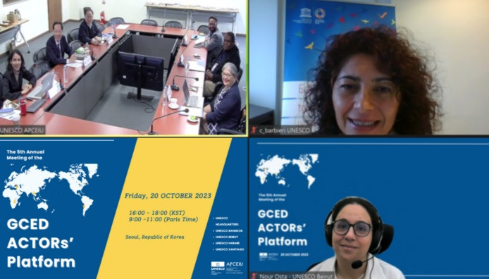 5th Annual GCED Actors' Platform Meeting 2023-11-10 20 October 2023 Together with UNESCO, APCEIU co-hosted the 5th GCED Actors' Platform Meeting on 20 October 2023. Following a three-year hiatus from in-person gatherings, this meeting brought together regional coordinators from four Regional GCED Networks, encompassing the Arab States, Asia-Pacific, Latin America and the Caribbean, and Sub-Saharan Africa in Seoul to share their achievements in advancing Global Citizenship Education (GCED) in their respective regions over the past year and discuss current challenges and potential ways to strengthen GCED implementation on both regional and global levels. The meeting commenced with the opening remarks from Mr Hyun Mook Lim, Director of APCEIU. In his remarks, Mr Lim reiterated the objectives of the GCED network and expressed optimism for generating fresh momentum to advance GCED within the various regions.Following the opening remarks, Ms Cecilia Barbieri, Chief of the Section of Global Citizenship and Peace Education at UNESCO HQs, welcomed the participants and gave a presentation on the future directions of GCED. Additionally, she underscored the significance of the revision of the 1974 recommendation and provided insights into UNESCO's strategies for upcoming years. APCEIU then offered an overview of the GCED Network programme since its inception.Regional coordinators from 4 regions were also invited to share the latest GCED programmes/initiatives and opportunities for implementing GCED and suggestions for joint GCED actions. Dr Faryal Khan from the UNESCO Bangkok Office gave updates on the GCED activities in the Asia-Pacific region, including the GCED publication targeting different Learners. Dr Charles Chikunda from the UNESCO Harare Office presented on the GCED activities in Sub-Saharan Africa, including the integration of GCED and Southern Africa Liberation History in the curriculum. Mr Cristián Bravo, from the UNESCO Santiago Office, presented on GCED activities in the LAC region, such as capacity building MOOC. Similarly, Ms Nour Osta from the UNESCO Beirut Office provided updates on the GCED activities in the region, including the integration of GCED into higher education institutions. The participants also engaged in a discussion session led by Director Lim of APCEIU. Participants discussed strategies to enhance the integration of Global Citizenship Education within their specific regions. Other Key topics explored during this session encompassed the significance of youth voices and the role of academia in integrating GCED, the importance of synergies among existing networks, fostering a shared understanding of GCED, and potential future partnerships between different offices and networks. https://www.unescoapceiu.org/post/4915