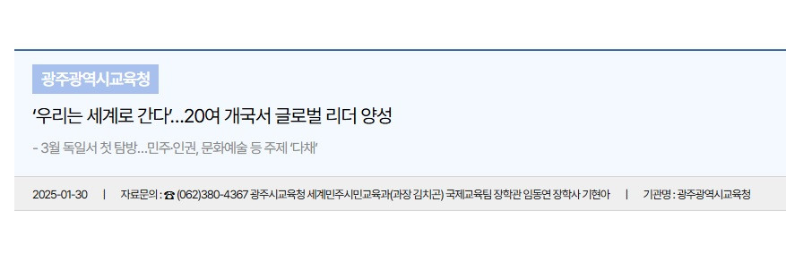 ‘우리는 세계로 간다’…20여 개국서 글로벌 리더 양성 2025-01-30 광주시교육청(교육감 이정선)이 학생들의 국제화 역량을 강화하고 세계시민의식을 갖춘 글로벌 리더로 키우기 위해 올해도 ‘학생 글로벌 리더 세계 한 바퀴’를 운영한다. ‘학생 글로벌 리더 세계 한 바퀴’는 지난해 16개의 다양한 프로그램이 운영돼 500여 명의 학생들이 독일, 미국, 호주 등 20개국을 탐방했다. 특히 참여 학생의 99.4%가 만족할 정도로 좋은 평가를 받았다. 시교육청은 학생, 학부모의 관심이 높은 만큼 학생 국제교류 사업 추진에 앞서 업체 설명회를 개최하는 등 공정성과 투명성을 확보하고 있다. 올해는 지난해와 동일하게 16개 프로그램을 운영하되, 내실화를 기한다. 주제는 민주·인권·평화, 5·18세계화, 역사문화, 봉사, AI디지털, 문화·예술·체육, 독서, 생태 교육 등 다양하게 마련했다. 첫 탐방은 오는 3월 ‘민주·인권·평화통일’을 주제로 독일에서 진행한다. 이번 프로그램에 참여하는 학생들은 6박8일동안 프랑크푸르트 재독 5·18단체와 기념식을 진행하고 5·18민주화운동 홍보활동을 펼친다. 또 유대인박물관, 베를린 장벽, 괴테 생가 등을 방문하며 독일의 민주 시민의식을 이해하는 시간을 가질 예정이다. 글로벌 리더 양성은 단위학교에서도 활발히 이뤄지고 있다. 지난해 광주지역 13개 학교 130여 명의 학생이 해외학술탐방을 통해 영국, 싱가포르 등 11개 국가를 체험했다. 또 온라인 국제교류를 통해 32개 팀 1천522명의 학생이 수업교류를 했으며, 초·중·고 15개 학교 227명의 학생들은 대면 교류활동을 진행했다. 이 밖에 광산교육국제화특구 사업의 하나인 ‘You & I Together’ 프로그램, 한국어교육 기반 국제교류 프로그램 ‘교수·학습 국제교류 교원연구회’, 한국어 수업 공유 프로젝트 ‘세계로 내딛다’, 국제 온라인 수업교류 ‘세계와 연결하다’, 학생들이 진로·적성 탐방을 위해 진행되는 ‘찾아가는 자기주도 진로 탐색 및 독서교류 프로그램’ 등도 운영한다. 시교육청은 올해 국립국제교육원과 유네스코 등과 협력해 ‘한일중 어린이 동화교류대회’, ‘한일 고교생 교류 사업’, 유네스코 학교 지원 등의 신규 사업을 추진하며 각 학교 주도 및 타 기관과 협력을 통한 국제교류를 확대할 계획이다. 이정선 교육감은 “우리 학생들이 국제교류 프로그램을 통해 5·18 광주정신과 K-POP 등 한국문화의 우수성을 전세계에 알릴 것으로 기대한다”며 “문화 다양성, 세계민주시민의식 등의 함양으로 글로벌 리더로 거듭나길 바란다”고 말했다. URL: https://enews.gen.go.kr/v5/?sid=25&wbb=md:view;uid:48314;&page=8