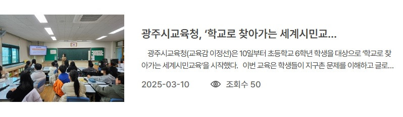 광주시교육청, ‘학교로 찾아가는 세계시민교육’ 운영 2025-03-12 광주시교육청(교육감 이정선)은 10일부터 초등학교 6학년 학생을 대상으로 ‘학교로 찾아가는 세계시민교육’을 시작했다.이번 교육은 학생들이 지구촌 문제를 이해하고 글로벌 시민으로 책임감을 키울 수 있도록 지원하고자 마련됐다.오는 7월 10일까지 실시되는 교육에는 초등학교 6학년 77개 학급 학생 1천690명이 참여한다. 특히 세계시민교육 전문 강사진이 학교를 방문해 ‘지구촌 문제 해결을 위한 이해와 참여’, ‘문화 다양성 존중 및 글로벌 소통 역량 강화’ 등 2개 주제로 학급별 맞춤형 강의를 진행한다.학생들은 뉴스 영상, 사진, 스토리텔링을 통해 기후 변화, 빈곤, 인권문제 사례를 학습하고, 다른 학생들과 모둠활동을 하며 해결 방안을 찾는다. 또 세계 각국의 음식, 의상, 축제, 인사법 등을 체험하며 문화적 차이에 대해 배운다.시교육청은 스토리텔링, 역할극, 프로젝트 기반 학습(PBL) 등 다양한 교수법을 적용해 학생들이 적극 참여하도록 할 계획이다.세계시민교육에 참여한 한 학생은 “기후변화와 빈곤 문제 등 지구촌 문제에 대해 깊이 고민하는 시간이었다”며 “환경 보호와 인권 존중을 위해 나부터 작은 실천을 해야겠다고 느꼈다”고 소감을 밝혔다.이정선 교육감은 “이번 교육은 학생들이 세계화시대에 발맞춰 국제문제를 올바르게 이해하고, 긍정적인 방향으로 풀어가는 지혜를 가질 수 있도록 지원하고자 마련했다”며 “학생들이 성숙한 세계민주시민으로 성장할 수 있도록 다양한 프로그램을 운영하겠다”고 말했다. URL: https://enews.gen.go.kr/v5/?sid=25&wbb=md:view;uid:48453;