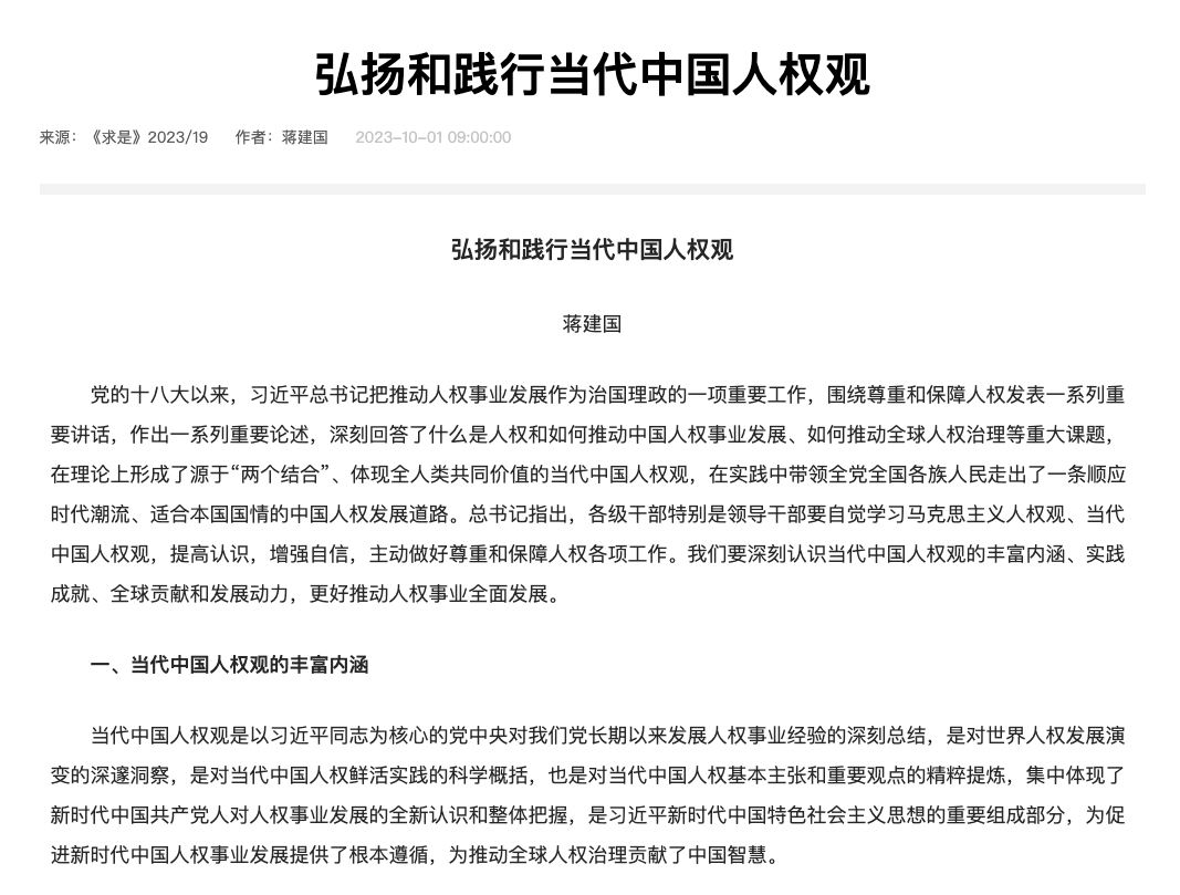 弘扬和践行当代中国人权观 2023-10-03 弘扬和践行当代中国人权观蒋建国 党的十八大以来,习近平总书记把推动人权事业发展作为治国理政的一项重要工作,围绕尊重和保障人权发表一系列重要讲话,作出一系列重要论述,深刻回答了什么是人权和如何推动中国人权事业发展、如何推动全球人权治理等重大课题,在理论上形成了源于“两个结合”、体现全人类共同价值的当代中国人权观,在实践中带领全党全国各族人民走出了一条顺应时代潮流、适合本国国情的中国人权发展道路。总书记指出,各级干部特别是领导干部要自觉学习马克思主义人权观、当代中国人权观,提高认识,增强自信,主动做好尊重和保障人权各项工作。我们要深刻认识当代中国人权观的丰富内涵、实践成就、全球贡献和发展动力,更好推动人权事业全面发展。 一、当代中国人权观的丰富内涵 当代中国人权观是以习近平同志为核心的党中央对我们党长期以来发展人权事业经验的深刻总结,是对世界人权发展演变的深邃洞察,是对当代中国人权鲜活实践的科学概括,也是对当代中国人权基本主张和重要观点的精粹提炼,集中体现了新时代中国共产党人对人权事业发展的全新认识和整体把握,是习近平新时代中国特色社会主义思想的重要组成部分,为促进新时代中国人权事业发展提供了根本遵循,为推动全球人权治理贡献了中国智慧。 中国共产党领导是中国人权事业发展的根本保证。尊重和保障人权是中国共产党人的不懈追求。习近平总书记指出,中国共产党领导和我国社会主义制度,决定了我国人权事业的社会主义性质,决定了我们能够保证人民当家作主,坚持平等共享人权,坚持以系统性思维谋划人权建设,推进各类人权全面发展,不断实现好、维护好、发展好最广大人民根本利益。只有在中国共产党领导下,中国人民才能不断创造更加幸福美好的生活,逐步享有更加广泛、更加充分、更加全面的人权。 人民幸福生活是最大的人权。人民是中国共产党执政兴国的最大底气,也是发展人权事业的最大动力。习近平总书记强调,要把人民利益作为出发点和落脚点,不断解决好人民最关心最直接最现实的利益问题,努力让人民过上幸福生活,这才是最大的人权。中国共产党坚持人民至上,坚持尊重人民主体地位,始终把人民对美好生活的向往作为奋斗目标,把反映人民愿望、体现人民利益、维护人民权利、增进人民福祉贯彻在人权事业发展的全过程各方面,不断提高尊重和保障人民各项基本权利的水平,切实增强人民的获得感、幸福感、安全感。我国不断完善对妇女权益的平等保障和特殊保护,发挥妇女在各个方面的积极作用。图为中国一重集团、哈电集团、中车齐车集团、大庆油田等企业单位一线工作的女职工群像(2023年3月6日至7日,王建威、张涛、谢剑飞、石枫、李玉龙、张雲淞摄)。 新华社发 生存权、发展权是首要的基本人权。把生存权、发展权作为首要的基本人权,是我们党根据人民需要和自身国情作出的必然选择。习近平总书记强调,生存是享有一切人权的基础。中国人民深知免于贫困、免于饥饿为生存之本。生存权利的有效保障,是享有和发展其他人权的前提和基础。发展权与生存权是紧密相连的。我们既充分保障人民的基本生存权,又切实保障人民享有平等参与、平等发展权利。 以发展促进人权是充分实现人权的关键路径。发展是实现人民幸福的关键。习近平总书记强调,在发展中保障和改善民生,保护和促进人权。党的十八大以来,以习近平同志为核心的党中央准确把握新发展阶段,完整、准确、全面贯彻新发展理念,加快构建新发展格局,推动高质量发展,将发展作为推动人权事业进步的发力点和解决所有问题的总钥匙,着力解决发展不平衡不充分问题,让发展成果更多更公平惠及全体人民,在推进中国式现代化进程中不断提升人权保障水平。 安全稳定的环境是推动人权事业发展的重要条件。安全是人的基础需求,平安是人民幸福安康的基本要求。习近平总书记强调,国家安全是民族复兴的根基,社会稳定是国家强盛的前提。社会稳定、国泰民安既是广大人民群众的热切期盼,也是我们党治国理政的重要目标。新中国成立70多年来,我们党领导人民创造了世所罕见的经济快速发展奇迹和社会长期稳定奇迹。新时代以来,中国民众的安全感始终保持高位,国际社会普遍认为中国是世界上最安全的国家之一。 坚持平等共享人权是发展人权事业的制度取向。习近平总书记强调,人权不是一部分人或少数人享有的特权,而是广大人民群众享有的普惠性人权。在推进当代中国人权事业发展的进程中,我们逐步建立以权利公平、机会公平和规则公平为主要内容的社会公平保障体系,不断完善对少数民族、妇女、儿童、老年人、残疾人等特定群体权益的平等保障和特殊保护,努力促进人民权利保障更加充分、人人得享共同发展。 法治是人权最有效的保障。全面依法治国关系人民幸福安康。习近平总书记强调,推进全面依法治国,根本目的是依法保障人民权益。我们充分发挥法治固根本、稳预期、利长远的保障作用,不断深化法治领域改革,健全人权法治保障机制,切实保证人民依法享有广泛权利和自由,不断提升人权法治化保障水平,努力让人民群众在每一项法律制度、每一个执法决