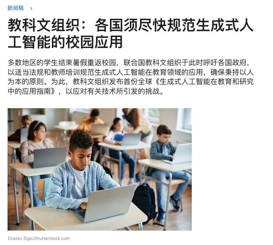 教科文组织: 各国须尽快规范生成式人工智能的校园应用 2023-10-04 多数地区的学生结束暑假重返校园,联合国教科文组织于此时呼吁各国政府,以适当法规和教师培训规范生成式人工智能在教育领域的应用,确保秉持以人为本的原则。为此,教科文组织发布首份全球《生成式人工智能在教育和研究中的应用指南》,以应对有关技术所引发的挑战。 "生成式人工智能可为人类发展带来巨大机遇,但也可能导致伤害和偏见。如若缺乏公众参与以及政府的必要保障和监管,人工智能就不能融入教育。教科文组织的这份指南将帮助政策制定者和教师从学生的基本利益出发,充分发挥人工智能潜能。"奥德蕾·阿祖莱阿祖莱,联合国教科文组织总干事 指南开篇解释了生成式人工智能的定义及其工作原理,接着阐述了生成式人工智能引发的争议及其对教育的影响,尤其是它如何加剧数字数据鸿沟。当前的ChatGPT模型训练以在线用户的数据为基础,而这些数据反映的是发达国家的价值观和主流社会规范。年龄限制:13岁指南随后提出了各国规范生成式人工智能应采取的7个关键步骤,并为在教育和研究中以符合伦理要求的方式应用有关技术建立政策框架,包括采用全球、区域或国别数据保护和隐私标准。指南还规定,在课堂中使用人工智能工具的年龄限制应为13岁,并呼吁就这一主题开展教师培训。该指南以教科文组织《人工智能伦理问题建议书》(2021年)和《北京共识——人工智能与教育》(2019年)为基础,倡导人的能动性、包容、公平、性别平等以及文化和语言多样性。指南还响应了教科文组织于2023年5月召开的首次全球生成式人工智能部长级圆桌会议表达的关切。9月7日发布指南在教科文组织数字学习周期间于其巴黎总部发布,千余名与会者在学习周期间围绕公共数字学习平台和教育中的生成式人工智能等主题展开讨论,发言者包括:⦁ 罗素(Stuart Russel),加州大学伯克利分校计算机科学教授⦁ 本希奥(Yoshua Bengio),蒙特利尔大学计算机科学和运筹学教授、魁北克人工智能研究所创始人兼科学主任、2018年图灵奖得主⦁ 杨立昆(Yann LeCun), Meta公司副总裁兼首席人工智能科学家⦁ 安德勒(Daniel Andler), 数学家、哲学家、法兰西人文院院士、法国索邦大学名誉教授生成式人工智能的课堂应用欠缺规范ChatGPT于2022年11月推出并成为历史上成长最快的应用程序,生成式人工智能随即引发公众关注。相应工具凭借生成文本、图像、视频、音乐和软件代码等能力,对教育和研究产生深远影响。然而,教育部门尚未做好准备,去以符合伦理规范、适应教学法要求的方式应用这些快速发展的工具。教科文组织最近开展了一项全球调查,覆盖超过450所学校,结果显示其中只有不到10%拥有关于生成式人工智能应用的机构政策和/或正式指南。缺乏国家级规范是导致这一现象的主因。教科文组织在2023年6月示警,在学校中使用生成式人工智能的速度太快,缺乏公共监督、审查或规范。其发布的一份文件显示,在课堂中使用生成式人工智能工具比出版新教科书所需的授权更少。