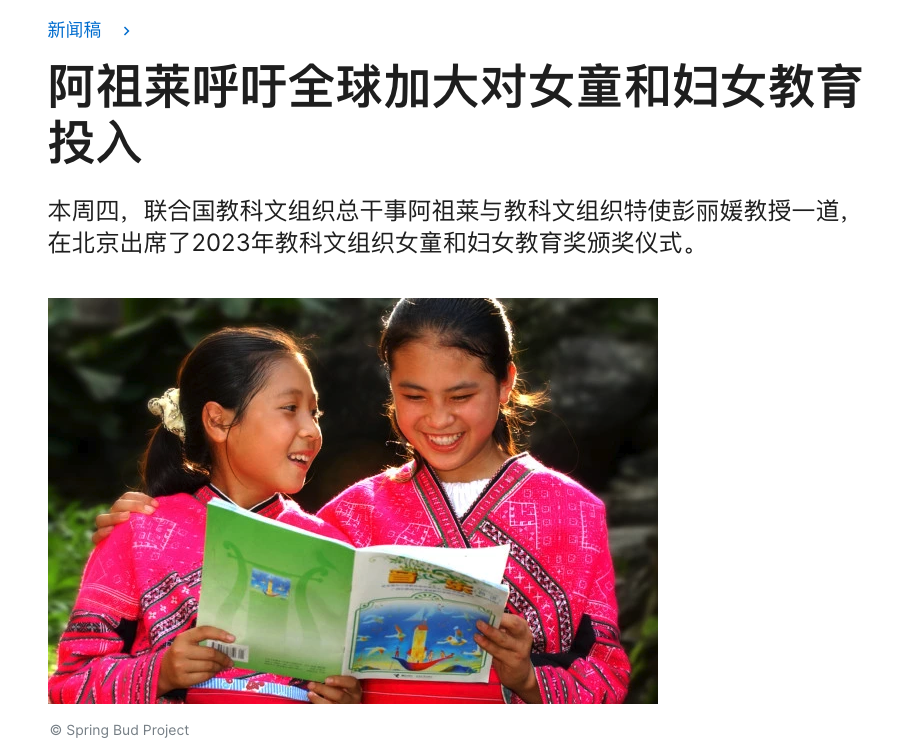 阿祖莱呼吁全球加大对女童和妇女教育投入 2023-10-04 本周四,联合国教科文组织总干事阿祖莱与教科文组织特使彭丽媛教授一道,在北京出席了2023年教科文组织女童和妇女教育奖颁奖仪式。 1995年,国际社会在北京通过了联合国《北京宣言》和《行动纲要》,以保障女性权益。自那时起,我们在教育领域的工作取得了重大进展。如今,全球 90% 的女童完成了初等教育,40% 以上的女性拥有接受高等教育的机会。这一良好势头须继续保持,因为教育领域内的性别平等尚未实现。如今,全球三分之二的成人文盲是女性。奥德蕾·阿祖莱阿祖莱,联合国教科文组织总干事 联合国教科文组织女童和妇女教育奖由中国政府资助,于2015年设立,每年奖励女童和妇女教育领域的杰出和创新项目。基于国际专家评委会建议,今年的获奖者为中国的“春蕾计划”和巴基斯坦的“星星学校计划”。“春蕾计划”为来自全中国56个民族的400万女生提供了获得优质教育的机会。“星星学校计划”保障紧急情况下的女童教育,已惠及54万余名少数族裔女童,包括阿富汗和罗兴亚难民,以及受2022年洪涝等自然灾害影响的女童。访华期间,阿祖莱还与习近平主席会晤。习主席重申中国支持教科文组织工作,并与其他所有会员国协同努力。总干事还参观了“明清故宫”和“周口店北京人遗址”这两处世界遗产地。教科文组织在过去3年间支持制作了一部关于“北京人”的中法纪录片,该片凸显了周口店北京人遗址考古成果的重要性。目前这部纪录片正在全球发行。