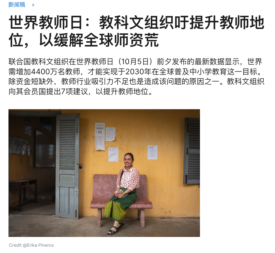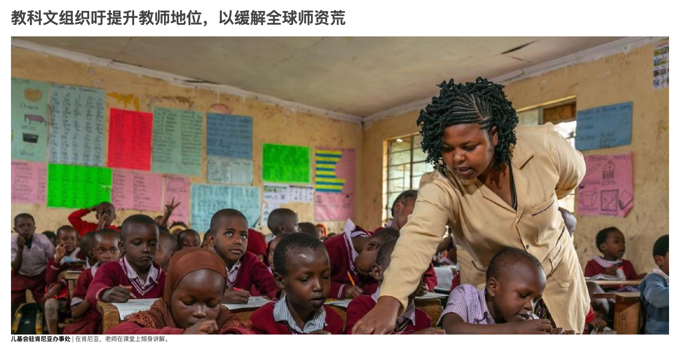 世界教师日: 教科文组织吁提升教师地位,以缓解全球师资荒 2023-10-05 联合国教科文组织在世界教师日(10月5日)前夕发布的最新数据显示,世界需增加4400万名教师,才能实现于2030年在全球普及中小学教育这一目标。除资金短缺外,教师行业吸引力不足也是造成该问题的原因之一。教科文组织向其会员国提出7项建议,以提升教师地位。"教师在我们的社会中扮演着至关重要的角色,然而,该行业正面临严重的人才危机。世界上有些地区缺乏人才储备,有些地区则存在新教师的高离职率。无论何种情况,解决方式都只有一个:我们必须加大重视教师职业,并优化教师培训和支持。"奥德蕾·阿祖莱阿祖莱,联合国教科文组织总干事 教科文组织在2016年估算的全球教师缺口为6900万人。2023年10月5日“世界教师日”当天发布的新分析报告显示,目前短缺人数为4400万,缺口降低近三分之一。尽管情况有所改善,但仍无法满足全球教育需求。南亚进展最为显著。该地区师资缺口估值降至780万,较2016年减半。相比之下,撒哈拉以南非洲进展较为缓慢,其目前短缺人数占到全球的三分之一。欧洲和北美尽管出生率较低,却仍存在480万名教师短缺,列世界第三。拉丁美洲和加勒比地区数值为320万。需让年轻一代青睐教师职业为深入了解师资短缺的根源,教科文组织展开相关研究。通过分析不同地区、不同发展水平的79个国家的离职数据,研究人员发现教师职业普遍缺乏吸引力。这导致年轻教师招聘困难,且离职率显著升高。在这79个国家的小学中,彻底离职教师的占比从2015年的4.62%上升至2022年的9.06%,增长近一倍。虽然各国实际情况差异较大,但存在3个相同的主因:工作环境差、压力大、薪酬低。多种因素影响到工作环境,如教育资源匮乏导致工作量增加,还有行政任务繁琐、学校领导不力,都可能挫伤教师士气。此外,压力水平也是一个问题:压力“很大”的教师希望离职的概率比其他教师高出2倍以上,入职不满5年的新教师尤其如此。低薪同样削弱了教师职业的吸引力。在小学教师待遇上,全世界仅半数国家提供的薪酬等于或高于其他需要相似资格水平的职业。在欧洲和北美,这个现象尤其严重,仅3成国家达到上述标准。在高中阶段,许多高收入国家支付给教师的薪水只相当于其他类似职业的75%,甚至更少。男教师和青年教师离职率更高男性教师的离职率通常高于女性教师。2021年,全球男性小学教师的离职率为9%,而女性为4.2%。这是因为男性往往在其他领域有更多就业机会,转行更为容易;另外,性别偏见也造成了这一差异,如儿童教育应由女性负责的传统观念等。在各国提交的报告中,教师在职业生涯中的离职时间点鲜有提及,不过现有数据显示,初入职场的教师离职率高于任职时间更长的教师,这表明他们需要更多的支持来应对工作负荷。教科文组织建议7项措施鉴于教师行业面临系统性短缺,教科文组织提出7项措施以提升教师职业吸引力。这些措施还需根据各国具体国情和问题予以调整。1. 投资于新教师培训和教师职业发展项目;2. 建立导师计划,让经验丰富的教师结对帮扶新教师,鼓励同行协作;3. 确保教师的薪酬、福利、晋升机会具有竞争力,尤其需要参照资格水平要求相似的其他职业;4. 简化行政任务和文书工作,以确保教师能够多专注于教学,而非行政事务。5. 设定合理的工作时间,减少非必需工作量,以促进健康的工休平衡。6. 提供心理健康和咨询服务,帮助教师应对压力和情绪问题。7. 建设强大且服务教师的学校领导力,使其重视教师付出,提供建设性反馈,并营造积极的工作环境。