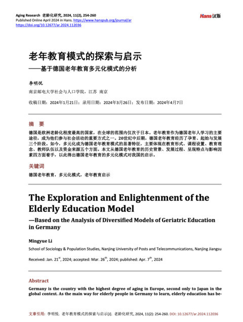 Europe and North America 老年教育模式的探索与启示 : 基于德国老年教育多元化模式的分析 (老龄化研究 第11卷 第2期) 2024 李明悦 汉斯出版社 德国是欧洲老龄化程度最高的国家,在全球的范围内仅次于日本。老年教育作为德国老年人学习的主要 途径,成为他们参与社会活动的重要方式之一。20世纪中后期,德国老年教育经历了孕育、起始与发展 三个阶段。如今,多元化成为德国老年教育模式的显著特征,主要体现在教育形式、课程设置、教育理 念、教师队伍以及资金来源五个方面。本文从德国老年教育的历史背景、发展过程、呈现特点与影响因 素四方面着手,以此得出德国老年教育的多元化模式对我国的启示。