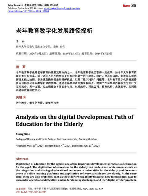 Asia and the Pacific 老年教育数字化发展路径探析 (老龄化研究 第11卷 第3期) 2024 肖向 汉斯出版社 老年教育数字化是老年教育的重要发展方向之一。老年教育数字化已取得一定成果,如老年大学教育资 源的整合和共享、适合老年人的在线学习平台和应用软件的出现等。同时,也存在问题,如老年人接纳 新技术能力较弱,容易遇到操作困难和理解挑战,以及“数字鸿沟”问题等。老年教育数字化的发展路 径应包括优化老年数字化课程资源,考虑老年学习者的需求和特点,提供个性化学习内容和充分的社交 互动机会;另一方面,应加强社会各界的参与度,包括政府、科技公司、教育机构、志愿者等,共同推 动老年教育的数字化。